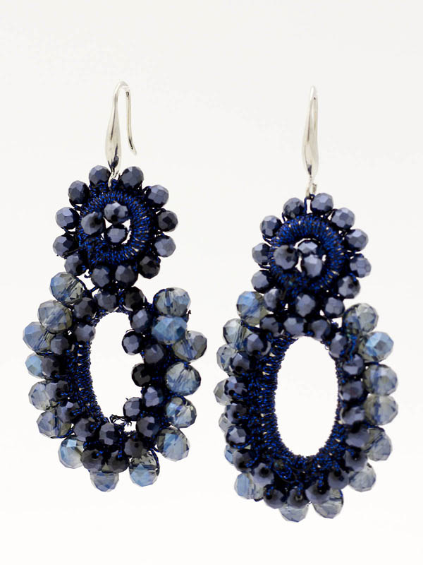 Серьги из хрусталя. Размер бусин в серьгах 4 мм, 6 мм. Хрустальные бусины закреплены на металлическую основу нитью люрекса. Диаметр окружности 20 мм. Размер овала 40*30 мм. Длина серег от швензы 5 см. Швенза-крючок.